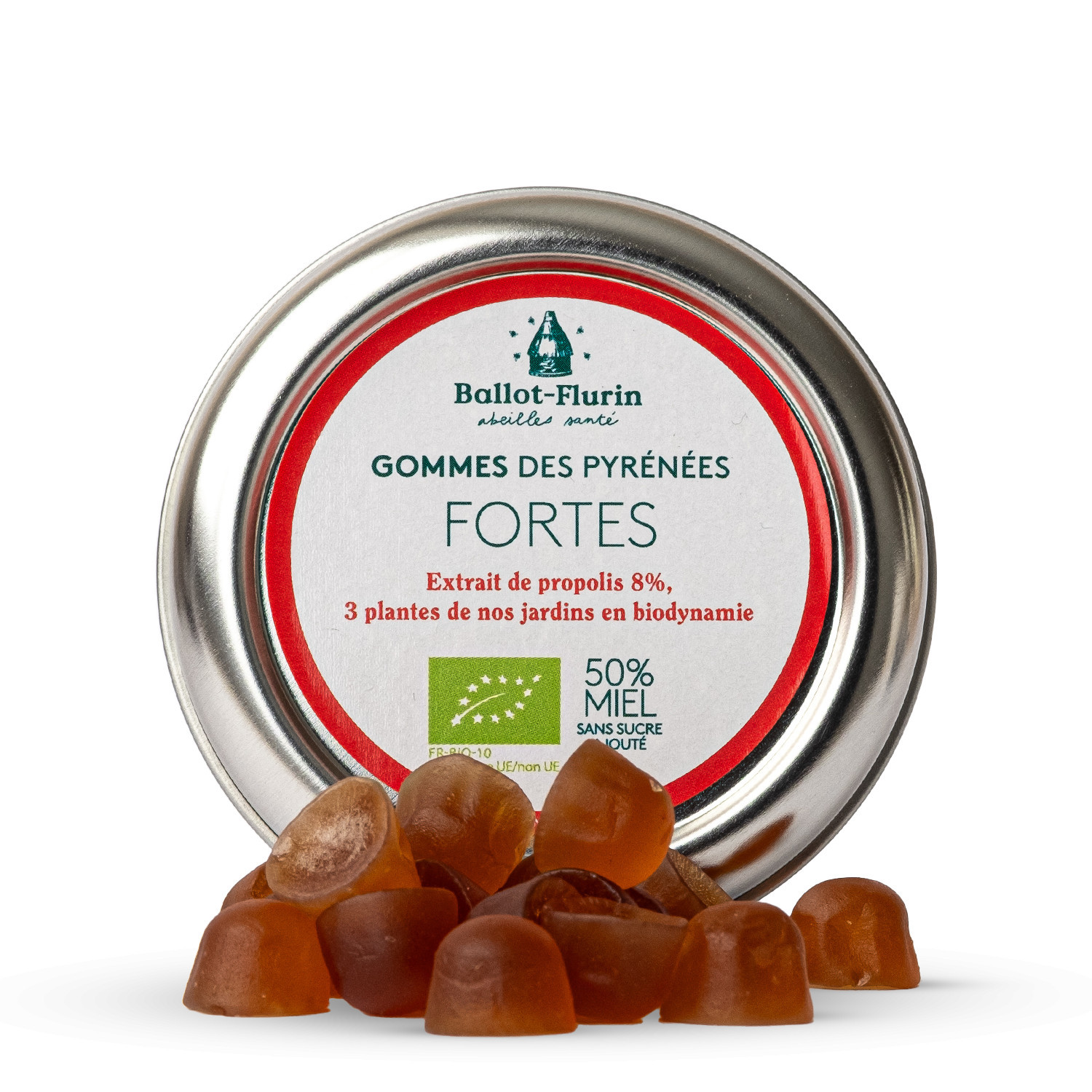 Ingrédients : Miel* 50%, gomme d'acacia*, extrait de propolis* 8% (hydromel*, eau de vie*, propolis brute*), extrait de plantes* 1,1% (eau de vie*, thym*, ronces à mûres sauvages*, orties*), agent d'enrobage* (huile de tournesol*, cire d'abeille issue de l'apiculture biologique).