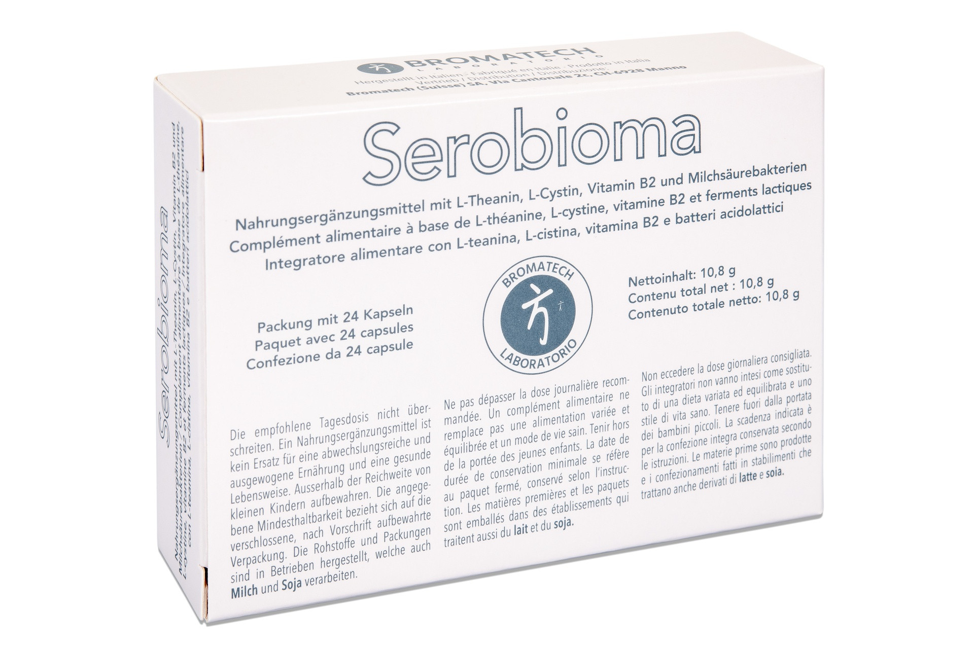 Amidon de maïs ; L-théanine ; gélatine (capsule) ; L-cystine ; mélange de ferments lactiques (Lactobacillus rhamnosus LR32, Bifidobacterium lactis BL04, Bifidobacterium longum BB536) ; acides gras ; antiagglomérants : sels de magnésium d’acides gras, dioxyde de silicium ; vitamine B2 (riboflavine) ; colorant : carbonate de calcium.